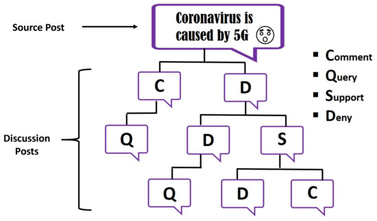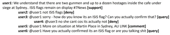 In Figure 1, an example thread of posts is presented for the case of the SDQC (Support–Deny–Query–Comment) stance detection task. It should be noted that an alternative stance detection task is presented in the SemEval 2016 task 6 [6], which is another classification task that labels tweets into the classes (a) favour, (b) against, and (c) neither. The main reason for selecting the SDQC stance detection task is that it provides the classes Query and Comment, which provide an indication of the conversational context surrounding rumours. This may lead to the discovery of certain patterns of comments and questions that can be indicative of false rumours and others indicative of rumours that turn out to be true [1].