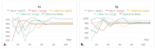 Another observation is that BERT performs poorly when compared to RoBERTa and ELECTRA; these two models were introduced after BERT and have obtained better results in several NLP tasks [29,30], and especially, RoBERTa is an optimized version of BERT; thus, achieving better results is expectable.