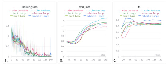 The variation of the experimental results of the six selected transformer-based models with respect to the training loss, evaluation loss and macro-averaged F1-score are shown in Figure 6. It is worth mentioning that the models were overfitted (i.e., the evaluation loss increased while the training kept decreasing) after the third epoch to the training data, and that resulted in acquiring the best F1-scores around the third epoch (step range: 25–45).