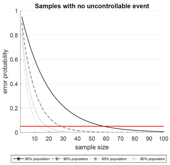 This is reflected in the increasing distances between the curves. The exact values for the sample sizes are reported in Table 1. A closer observation of the error probabilities for the 85% population with no uncontrollable event revealed that the first sample size whose error probability drops below the threshold of 0.05 is a sample size of n = 19 (p = 0.0454), while the sample size of n = 18 is still above the threshold (p = 0.0510). The sample size of n = 20 revealed an error probability of p = 0.0396 (see Table 1).