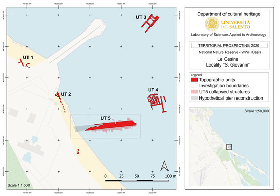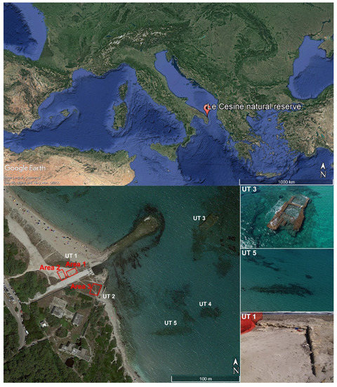 Upper Panel: Geographical position of the archaeological site Le Cesine. Lower left-hand side panel: georeferenced view of the prospected areas. On the right-hand side, three zooms are shown, specifically (from the top to the bottom) on the zone UT3 (the so-called “submerged church”), the zone UT5 (remains of the submerged pier a few tens of meters from the shore) and the zone UT1 (structures on the ground intercepted in the 1990s).