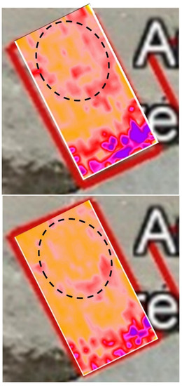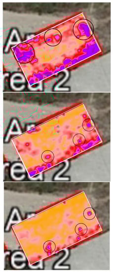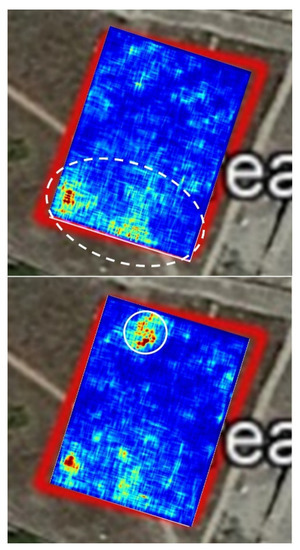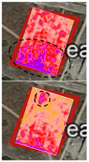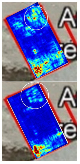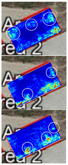To avoid pedantic repetitions, here we will present only the results that appeared to us heuristically more interesting, and, in particular, we will show results at 600 MHz with regard to Area 1 and Area 3, whereas we will show results at 200 MHz with respect to Area 2. The “classic” data processing was performed with the Reflexw code and consisted of zero timing, background removal, linear and exponential gain vs. depth, 1D filtering (so as to remove undesired low-frequency peaks in the spectrum of the signal related to the gain vs. depth) and Kirchhoff migration [20]. The propagation velocity exploited for the focusing of the targets and for the time-depth conversion has been evaluated on the basis of the visible diffraction hyperbolas. In particular, we have chosen 11 cm/ns in Area 1 and Area 2, and 12 cm/ns in Area 3. On the basis of the processed Bscans, we evaluated in all the areas a penetration time-depth of about (roughly) 50 ns. Time slices [21,22] have been retrieved so to achieve flat horizontal maps at different depth levels. In Figure 3, the most meaningful results in Area 1 (at 600 MHz) are shown; in Figure 4 the depth levels of largest interest in Area 2 (at 200 MHz) are shown and, finally, in Figure 5, the most interesting results in Area 3 (at 600 MHz) are shown.