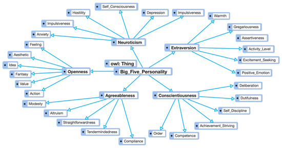 We look back at some previous work on this topic to comprehensively understand the ontology approach to measure personality based on social media activity usage. Sewwandi [37] approached this methodology by designing the model using the ontology web language (OWL), a well-known ontology developing language. The research categorized the data acquired into Eysenck’s three-factor personality model with help from an eminent psychologist. Several researchers work on the theoretical and practical implementation of the connection between ontology models and psychological profiles. Egloff [38] introduces an ontology model for inferring psychological profiles to capture and formally measure characteristics in digital humanity. In an earlier effort, McCrae et al. [39] created a model called Lexicon Model for Ontologies (Lemon) as the common platform to share the terminology and lexicon resources from the semantic web; however, some researchers use this general model to a specific application in psychology, but primarily for the English language. Furthermore, other research created the same ontology model, using Indonesian language and Big Five Personality Traits as the cornerstone of the study, which was also assisted and assessed by a psychologist [40]. Noy and McGuinness [41] stated that ontology modeling in personality measurement is mainly used to share a common understanding of the information structure, reuse, and analyze the domain knowledge.