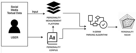 The platform architectural diagram is shown in Figure 5. Our platform architectural diagram and framework representation consist of user test data input, personality corpus, and the n-gram language model parser. The results of textual personality measurement will be displayed in the form of a spider plot or radar diagram. We built the platform using the flask framework of the python programming language as the main engine and a SQL database mainly to manage the personality corpus. The interface for input and output is shown as a web platform. The personality corpus provides data feeds to the personality measurement platform. Together both map the word/phrases from the n-gram parsing process and show the result as personality radar. The employed technologies to support the mechanism are the searching and matching process, the input data and the personality corpus in the database.