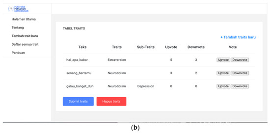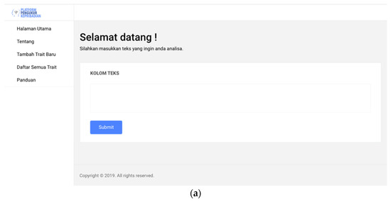 The platform is called Platform Pengukur Kepribadian; this is the Indonesian language version of the Personality Measurement Platform. The platform can be accessed via the address http://kepribadian.labscbd.id (accessed on 7 October 2021). The platform interface shown in Figure 6a consists of input text or phrase and submit button, while the voting page for the voting mechanism on each word or phrase is shown in Figure 6b.