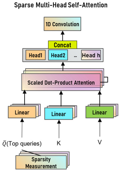 Sparse measurement is the compression of queries to obtain a sparse representation of the queries, i.e., a sparse matrix. An effective sparse representation not only ensures information quality but also reduces the computational complexity of model training. From Figure 2, we can easily observe that the multi-head attention module processes the input queries, keys, and values in a parallel manner, which is what makes it surpass the classical deep learning models LSTM and GRU. Not only that, although h attention heads are used, the total computational cost of all attention heads is similar to the full-dimensional single-head attention because the dimensionality of each head is reduced.