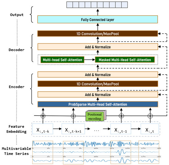 Encoders can be stacked to obtain stronger data characterization capabilities. Each encoder includes two core sublayers. The first is the sparse multi-head self-attention layer, which is mainly responsible for the adaptive learning of data features. In the self-attention layer, all keys, values, and queries come from the output of the previous layer. The other core sublayer is a 1D convolutional neural network layer. In the encoder, the residual connection method is used between layers, and after each sub-layer, there is a normalization layer that plays an auxiliary role. Each position in the encoder can focus on all positions in the previous layer of the encoder.