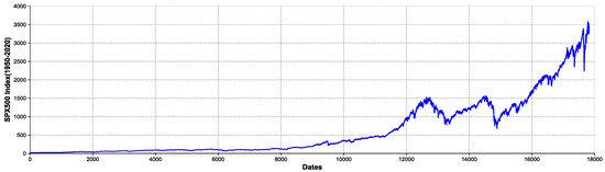 Take the SPX500 dataset as an example. The data coming from Yahoo! Samples are collected every minute from 3 January 1950, to 4 November 2020. The source dataset contains 17,827 observations, each of which contains the open, low, high, close, volume, and Adj close. Each feature constitutes an independent time series. In these series, we calculate the Adj close to obtain a continuous composite logarithmic rate of return and historical volatility. Figure 4 shows the trend of the SPX500 (1950–2020) index. From Figure 5, we can observe that the series has obvious nonlinear and wave aggregation characteristics.
