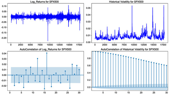Figure 6 shows the log return, volatility, and autocorrelation of the SPX500 index. Volatility is defined as the deviation of asset returns from the mean. In this paper, we estimate volatility by calculating the standard deviation of log asset returns.