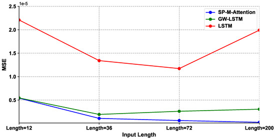 The LOSS (MSE) trends of SP-M-Attention, GW-LSTM, and LSTM models under different input lengths.