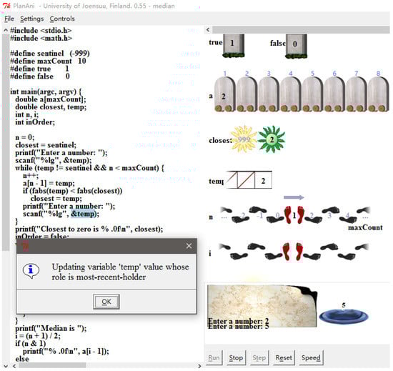 The C Language Programming Course in the experimental group was conducted as follows. Firstly, the role of the variable was gradually presented in the theoretical lectures (see Figure 2). The teacher provided some basic concepts of C programming language covered by case programs. As a new role appearing in the case program, the teacher instructed its definition in detail with the role-based animation and provided students with a case program in the PlanAni system (the more information about PlanAni can be found in the coming related contents). Thereafter, the teacher will repeat the informal definition and characteristics of a role whenever it reappeared in the forthcoming case programs. In practice, the code tracing and debugging technologies, supported by the generic visual IDE (Integrated Development Environment), were employed to visually show the life cycle of the variable and intuitively elaborate the function of a role. The teacher set breakpoints in the program codes and systematically explained the sequence of states of each variable role and its dependency on other variables with the visual debugging tools of IDE, such as QuickWatch, Step over, Set Next Statement, and so on. During the process, the teacher and students predicted the following states of a variable and the other variables it depended on, viewed its execution process, and checked the final execution result. To deepen and consolidate students’ understanding of the roles of a variable, in the next two homework assignments, participants must outline the role and reason for its adoption.