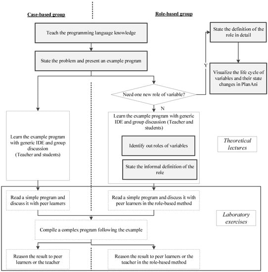 The theoretical lectures and laboratory exercises of the course were methodically conducted. The pedagogical resources, such as case programs, laboratory tasks, homework assignments, and the sum of teaching time, were the same in the experimental and control groups, but roles of variables were only carried out in the experimental group (see Figure 2).