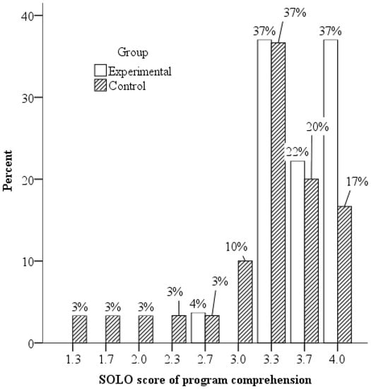 This research also suggests that the students with role-based teaching tend to present relational answers to the program explanations, which helps them to become experts. In Figure 3, students with SOLO scores of program comprehension of 3.3, 3.7, and 4.0 accounted for 37%, 22%, and 37% of the total number of students in the role-based group, compared to 37%, 20%, and 17% of the classical case-based group. The SOLO score of program comprehension of 3.3, 3.7, and 4.0 mean that students scored out of one, two, or three full SOLO scores of responses for EXPL. According to Table 1 and Table 2, a full SOLO score of program comprehension indicates that a novice programmer can read the code reasonably and systematically and extract their objectives. Expert programmers were good at presenting their program summaries by concentrating on both language-level concepts and problem domain-level concepts []. Thus, these results imply that the roles of variables can help the novice read several lines codes and integrate them into a coherent structure [] like an expert.