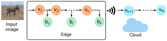 Next, for each input image, we can obtain the classification confidence as and verify if the confidence is greater than or equal to a given confidence threshold . If so, the i-th side branch can classify the image as follows , where corresponds to the inferred class. In this case, the DNN inference terminates, and no further data processing is required throughout the remaining DNN layers. In this case, early classification can reduce the inference time. However, suppose the confidence value is less than . In that case, the input image must continue throughout the remaining DNN backbone layers until it reaches the next side branch, where the same procedure is repeated. If none of the side branches produces confidence greater than or equal to , the image is processed by the remaining DNN backbone layers until it reaches the output layer. This layer thus generates a probability vector and computes the classification confidence. Suppose this confidence value provided by the DNN backbone’s output layer does not reach . In that case, the classification chooses the class with the highest confidence value among all side branches and the output layer of the backbone [11,23].