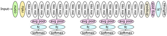 MobileNetV2’s architecture consists of a convolutional (conv) and Rectified Linear Unit (ReLU) layers, followed by 19 inverted residual (inv res) layers. The data is then passed through a dropout layer and an average pooling (avg pool) layer. Finally, a fully connected (fc) layer and a softmax layer are used to perform classification. The side branches are then introduced in the indicated positions.