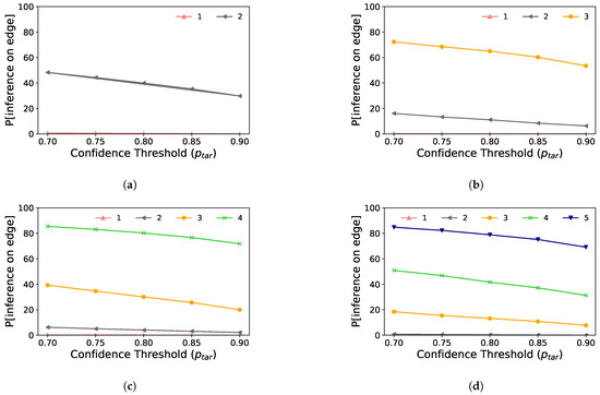 Figure 4 shows the probabilities of performing inference on the edge device for multiple early-exit configurations. We train each scenario with a fixed number of side branches. Note that this fixed number varies from two, Figure 4a, to five, Figure 4d. The curves on each figure were generated by “activating” only the corresponding number of side branches at a time. Each curve is labeled with a number n. This number indicates that the first n side branches are activated for the experiment. For example, Figure 4c considers an early-exit DNN trained with four side branches. Hence, the curve labeled as 2 indicates a situation where only the first two side branches are activated. In the same way, the curve labeled as 4 indicate the activation of all side branches for that DNN. Consequently, we measure the proportion of samples on the test set classified up to that branch while varying the confidence threshold. The yellow curve on Figure 4c shows that close to 40% of all samples were classified up to the third side branch, while the green curve shows that close to 80% of all samples were classified up to the fourth side branch, which includes samples classified by the third side branch.