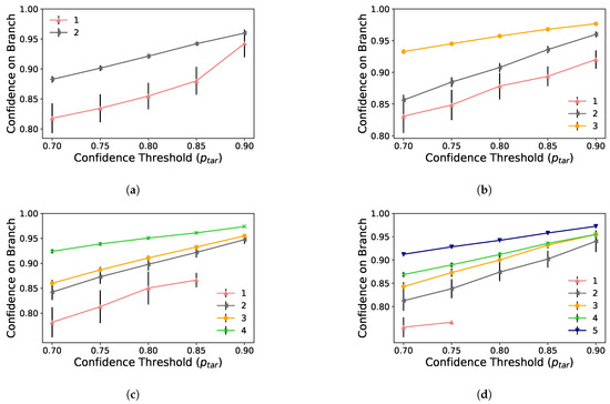 This section investigates the impact of side branches positioning along the early-exit DNN architecture on the classification confidence. The confidence can be a fair estimate for accuracy in a calibrated DNN [31,32]. Consequently, this section also evaluates how side branch placement impacts early-exit DNN performance. To this end, this experiment performs early-exit DNN inference on all images from the test set. We collect the classification confidence at the branch that classified the image for each of these images. Then, we compute the mean classification confidence with confidence intervals of 95%. We repeat this experiment for each confidence threshold and number of side branches in early-exit DNN model, as described in the previous section. For this experiment, all branches are activated. For example, using the reasoning of Section 5.1, we consider only for a DNN with four side branches and for a DNN with five side branches.