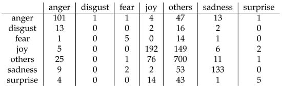 For Spanish, a new dataset with 8409 annotated tweets, the EmoEvent corpus [], was recently created. The tweets are classified according to the six Ekman’s categories, and the extra category others. The corpus was annotated by crowd-sourcing, each tweet received a label from three different annotators, and the final tweet label is chosen by majority vote. Tweets annotated with three different classes are assigned to the others class. Inter-annotator agreement was measured for the seven classes, showing that disgust, fear, and surprise have the lowest values. The corpus is also annotated with some extra information: topic and offensive content. As the tweets were selected by filtering those referring to certain predefined relevant events (Game of Thrones, Notre Dame Cathedral Fire, Venezuela’s institutional crisis, etc.), a tag indicating which event the tweet belongs to is included. In addition, each tweet has a binary tag for offensive content annotation. In 2020, the Iberian Languages Evaluation Forum (IberLEF 2020) introduced for the first time a task on emotion evaluation in Spanish tweets, as part of the TASS 2020 task [], which traditionally addressed tweets polarity classification. In IberLEF 2021 [], a task only for emotion classification, EmoEvalEs [], was proposed. Both editions of the task used the EmoEvent corpus.