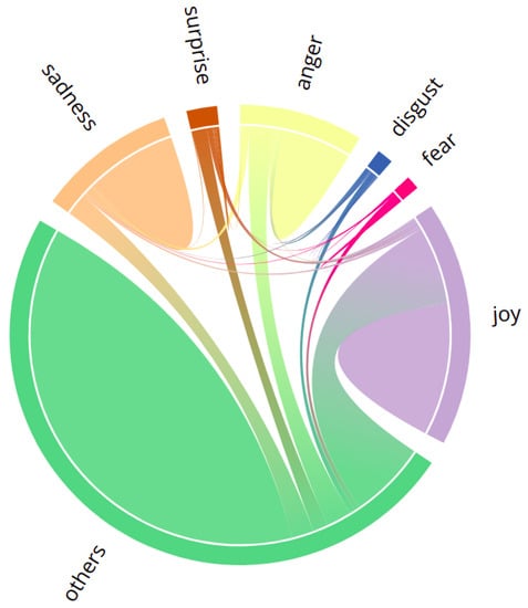 This can be seen graphically in Figure 2 as well. In this diagram, the crossing arcs represent cases in which the classifier is wrong, and the bumps inside categories represent cases when the classifier is right. We can see in this diagram that the others category is the most numerous, and approximately a quarter of their expected values are classified as other categories. The class joy, on the other hand, has close to half of its examples classified as others. Note that categories surprise, fear, and anger have almost no visible bump, as almost no example of these categories is correctly classified. Furthermore, we can see that the disgust class is wrongly mistaken with the anger and others category in similar proportions.