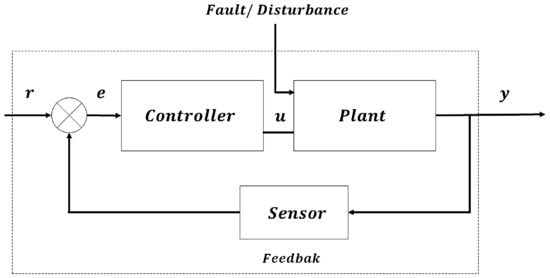 Block diagram representing the dynamic system under the presence of faults. Here, r is the reference signal, u is the control input, y is the output and e is the regulation or tracking error.
