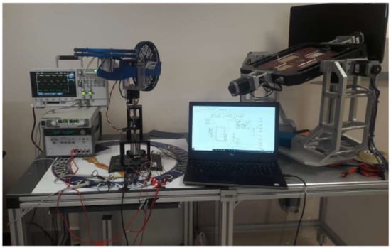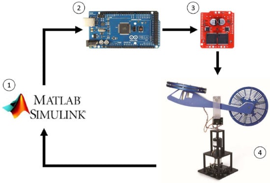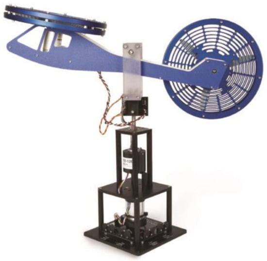 An Arduino® Mega 2560 is used to communicate with the physical system, where the pulse width modulation method is implemented to command the motor. For the power part, a Monster Moto Shield is utilized, with a voltage capacity of 16 volts and 30 amperes of current, with a 20 KHz PWM frequency. The sensing was carried out by two rotary optical encoders, one placed at the base of the platform, which allows the yaw angle to be measured, and the other one is placed in the center of the platform which measures the pitch angle . The acquired data is processed in Matlab®. The experimental platform is shown in Figure 2 and its corresponding schematic diagram in Figure 3.