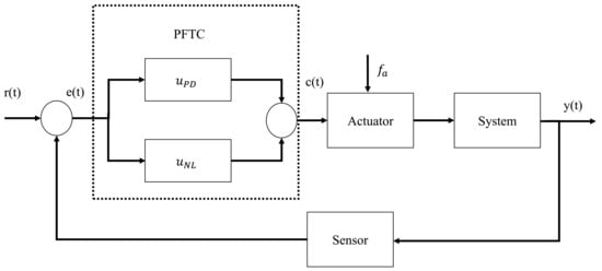 A well-designed robust controller can ensure stability and maintain an acceptable closed-loop performance in a large number of circumstances, event in the presence of some actuator faults. Recently proposed FTC methods are based on robust techniques such as those shown in [10,11]. FTC strategies are classified into two categories: The first one is named Active Fault-Tolerant Control (AFTC) which consists of reacting to a component’s malfunction (e.g., actuators, sensors, and even the system itself) by reconfiguring the system’s controller. To do so, the system’s controller needs to be a reconfigurable one. Moreover, it needs to use the information from a Fault Detection and Diagnostic scheme (FDD) and a device to reconfigure the controller. All this requires redundancy in different components that make up the control system. Moreover, the second one is called Passive Fault-Tolerant Control (PFTC) which consists of designing, a priori, a controller that supports a certain number of known faults and does not require additional mechanisms or a reconfiguration of the controller. Therefore, since in PTFC no additional mechanisms or reconfigurations of the controller are needed, the probability of presenting a lack of stability or poor performance of automatic control system diminishes, see [12,13]. According to [14], PFTC does not involve the combined estimation of control signals and faults. Compared to the AFTC method, the PFTC control uses the same control strategy before and after faults [15]. Besides, under the presence of a passive fault, the PFTC requires neither fault diagnosis nor controller redesign [16]. The basic idea of PFTC is to make the closed-loop system robust against uncertainties, as well as to a restrictive set of probable failures, assuming that it is possible to guarantee that a fault acts as an uncertainty to the system, in a way that can be limited. In that case, a carefully designed robust controller can achieve tolerance to a wide range of faults.