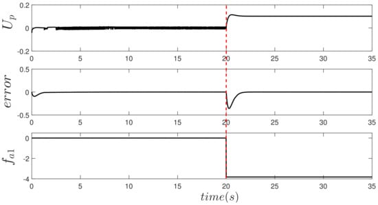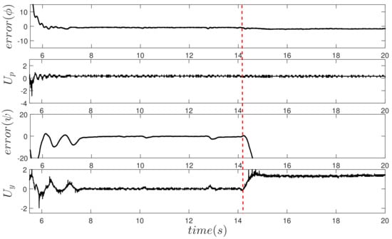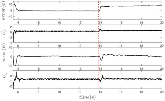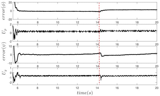 Figure 12 shows the evolution in time of the error in the angles , , and the control signal provided by the PFTC. It is considered an abrupt failure of at 14 s. Due to the magnitude of the fault, the angle presents deviation, which is reflected in the position error (error ) and the increase of the controller signal. While the PFTC control compensates for the error, it does not maintain the desired position; however, the system can continue to operate safely, with a mild deviation.