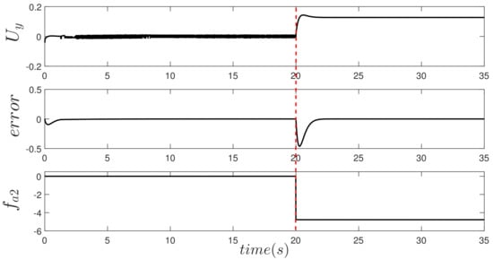 The presence of a partial abrupt failure of is considered in actuator two (actuator two produces the motion); the dotted red line indicates the time of occurrence of the fault at 20 s. A fault greater than that of actuator one is considered; for this test, the failure considered is ; this is to make it more noticeable. The Figure 7 shows the error, the control signal for actuator two (), and the fault behavior (). In the presence of the fault, the error is different from zero, which physically indicates that the angle yaw has changed with respect to the desired one; therefore, the fault-tolerant control algorithm reacts by increasing the control signal, trying to compensate for the presence of the failure, causing the error to return to the desired value or very close to this.