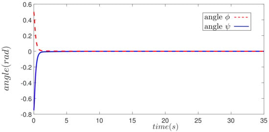 In the case of regulation, the following initial conditions are given = , = . Under nominal conditions, the implemented control fulfills the control objective. Figure 10 shows the evolution in time of the error in angles.