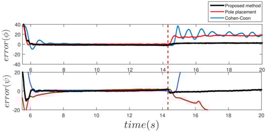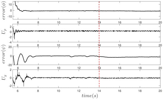 Figure 11 shows the evolution in time of the error in the angles , , and the control signal provided by the PFTC. It is considered an abrupt failure of at 14 s. In the interval from one to six seconds oscillations of the system are shown, this is because the initial conditions are different from zero. The fault appears at second fourteen. While the fault acts directly on the lift motor, it also affects the angle . Once the failure occurs, both angles present a deviation; however, the proposed PFTC acts to compensate for this effect, maintaining the control objective.