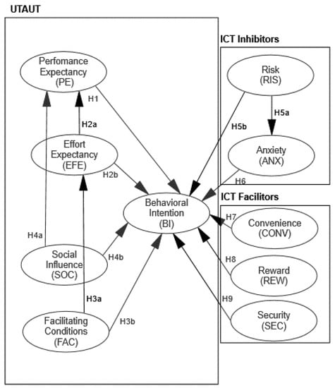 Based on the literature review, a proposed conceptual model aimed at exploring the pre-adopt stage of users’ behavioral intention towards MSC adoption along with the initial research hypotheses were formulated (Figure 1). The suggested framework extends the UTAUT model with the basic facilitators and inhibitors of ICT. In the rest of this section, these variables are described in detail, and the research hypotheses are developed.