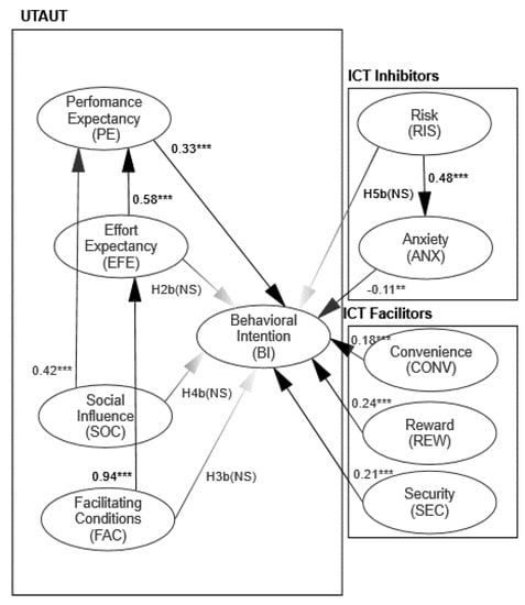 With regard to anxiety, as was anticipated, it exerts a negative impact on behavioral adoption intention (β = −0.11, p < 0.001), while risk is greatly associated with anxiety (β = 0.48, p < 0.001). Thus, both H6 and H5a are confirmed. Ultimately, it is considered of great importance that all the ICT facilitators of the model exert a significant positive impact on behavioral intention. In specific, convenience (β = 0.18, p < 0.001), reward (β = 0.24, p < 0.001) and security (β = 0.21, p < 0.001) are associated with behavioral intention. Therefore, H7, H8 and H9 are supported in this study. Overall, 75.251% of the variance is mutually explained by the constructs of the structural model.