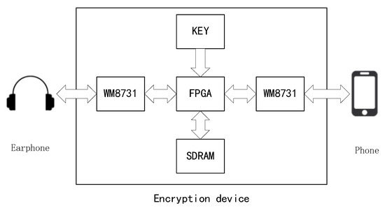 This article introduces an encryption device for real-time voice communication based on the FPGA design [7,8]. It does not require special lines or additional voice call equipment. It combines voice scrambling and FPGA digital signal processing to produce a hybrid encryption method that is suitable for various types of voice communication [9]. The appearance of this product is just like a headset, and it can be used after plugging in a mobile phone. The voice signal is collected and encrypted by the encryption device, and then sent to voice communication devices such as mobile phones for transmission through the communication channel, which solves the security problem of eavesdropping during the voice transmission process and protects the privacy of users.