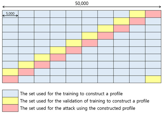 In this experiment, of the 50,000 power consumption traces collected, 40,000 were used for training, 5000 were used for the validation of training, and 5000 were used for attack processes. For attack, only one trace selected from 5000 traces is used, that is, the attack is a single-trace attack. Then, all of the data were divided into a total of ten cases, as shown in Figure 2 and K-Fold cross-validation [31] was performed.
