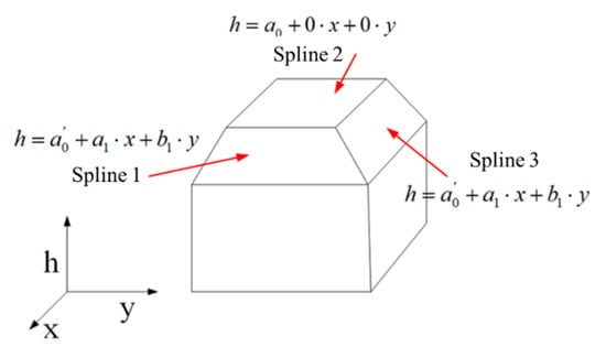 As can be seen from Figure 2, each roof panel of a four-slope building can be considered as an inclined surface of different angles in 3D space, and the top flat roof panel can be represented as a 0th-order spline, while the four sloping roof panels on the side can be represented as 1st-order splines with different parameters. Connecting the spline functions through the ridge line forms the roof geometry of the building, which means that the spline functions can accurately describe a typical building roof.