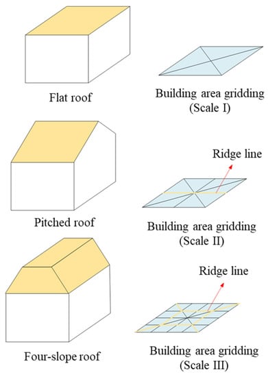 Note that the spline function is a segmental function. Only by dividing in the appropriate interval can the specific building roof structure be accurately described. The spline function of each region constitutes each roof panel of the building, the intersection line between the intervals corresponds to the ridge line of the building, and for buildings with different roofs, the location and direction of the ridge line are not fixed. In order to characterize the different directions and positions of the roof ridge lines of different structural buildings, the building area needs to be gridded at different scales to approximate the roof ridge lines of different buildings. The gridding of the building area at different scales is shown in Figure 3.