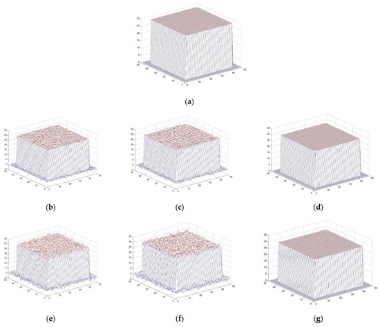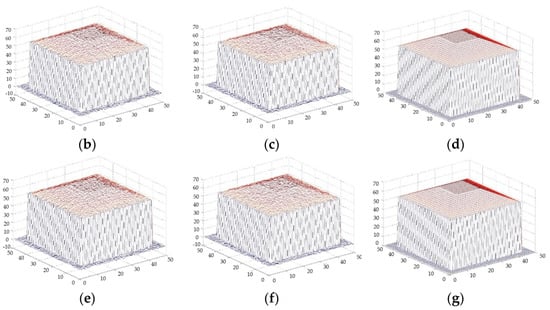 Comparison of the effect before and after the fusion of flat-roofed buildings with different variance Gaussian noise. (a) DSM of the truth map for flat-roofed building. (b) DSM 1 variance 0.5. (c) DSM 2 variance 0.5. (d) DSM after fusion variance 0.5. (e) DSM 1 variance 1. (f) DSM 2 variance 1. (g) DSM after fusion variance 1.