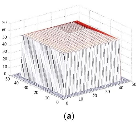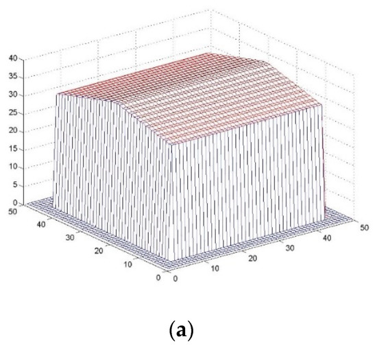 In order to verify the performance of the fusion algorithm under different roof shape building conditions, firstly, the target DSM with different roof shapes was generated as the truth map using computer simulation, and then Gaussian noise with different variances was generated and superimposed on the truth map DSM to generate two sets of observations, called DSM 1 and DSM 2. The two sets of noise-doped DSM 1 and DSM 2 were fused by executing the proposed DSM fusion algorithm, and the fusion results are shown in Figure 4, Figure 5 and Figure 6.