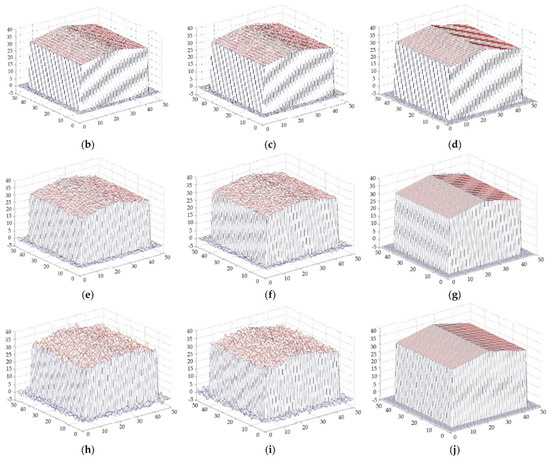 Comparison of the effect before and after the fusion of pitched-roofed buildings with different variance Gaussian noise. (a) DSM of the truth map for pitched-roofed building. (b) DSM 1 variance 0.1. (c) DSM 2 variance 0.1. (d) DSM after fusion variance 0.1. (e) DSM 1 variance 0.5. (f) DSM 2 variance 0.5. (g) DSM after fusion variance 0.5. (h) DSM 1 variance 1. (i) DSM 2 variance 1. (j) DSM after fusion variance 1.