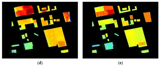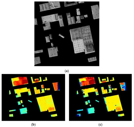 In this paper, two different stereo matching algorithms are used to generate two sets of DSMs for IKONOS data: Method 1 is a stereo matching algorithm based on the modified Census transform [], Method 2 is a robust stereo matching algorithm using adaptive random walk with restart [], and then the proposed DSM fusion algorithm is executed to obtain the final DSM. Combined with the truth map to compare and analyze the errors, the experimental results are shown in Figure 7, and the RMSEs before and after DSM fusion are shown in Table 4. The experimental results showed that the proposed method can effectively constrain and improve the DSM of the building, and the integrity of the overall construction of the target 3D model structure was significantly improved.