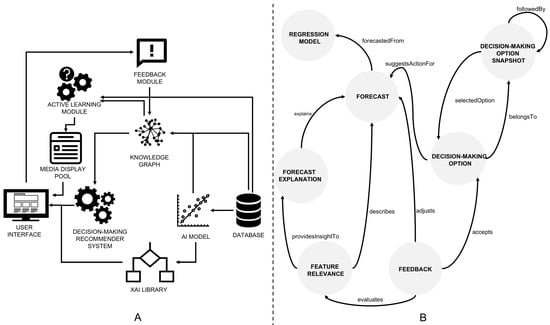 The knowledge graph is a central component of the system. Instantiated from an ontology (see Figure 1B), it relates forecasts, forecast explanations, decision-making options, and feedback provided by the users. To ensure context regarding decision-making options and feedback provided is preserved, different relationships are established. The feedback entity directly relates to a forecast, forecast explanation, and decision-making option. While a chain of decisions can exist for a given forecast, there is a need to model the decision-making options available at each stage and the sequence on which they are displayed. To that end, the decision-making snapshot entity aims to capture a list of decision-making options provided at a given point in time. A relationship between decision-making option snapshots (followedBy) provides information on such a sequence. For each decision-making snapshot, a selectedOption relationship is created to the user’s selected decision-making option. A suggestsActionFor relationship is created between the forecast entity and entities that correspond to the first decision-making options displayed for that particular forecast. Since the decision-making options are linked to decision-making option snapshots and preserve a sequential relationship, all decision-making options can be traced back to the forecast that originated them.