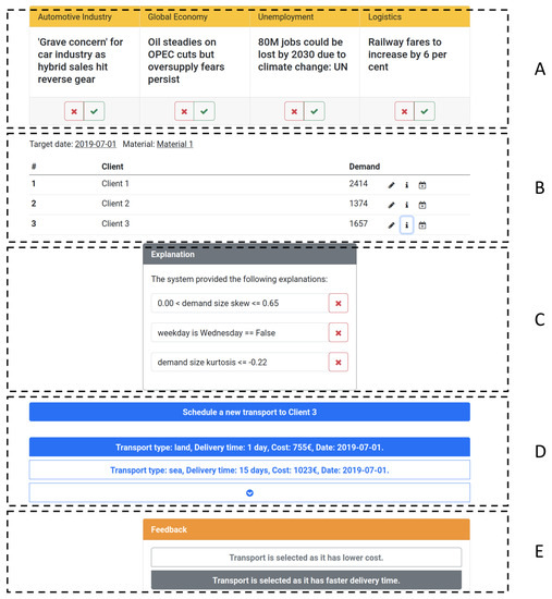 Demand forecasting is a key component of supply chain management since it directly affects production planning and order fulfillment. Accurate forecasts enable operational and strategic decisions regarding manufacturing and logistics for deliveries. We developed a model to forecast demand on a material and client level daily. The model was trained on three years of data for 516 time-series corresponding to 279 materials and 149 clients of a European automotive original equipment manufacturer’s daily demand. While the forecasts were created and evaluated for all of the clients and materials, we used a subset of them to evaluate the application (e.g., the forecast explanations, media news we display, and recommended decision-making options). We generated forecast explanations using the LIME library [], but other approaches could be used too (e.g., LionForests [] or Shapley values []). We implemented two strategies for decision-making options recommendations, which allowed us to select a new transport or chose among existing ones. The first one consisted of a set of heuristics that satisfy certain criteria (e.g., have enough capacity to satisfy the expected demand for a given client), while the second one was a knowledge-based recommender. To enhance the context understanding related to demand forecasting, we display media entries for predetermined topics (Automotive Industry, Global Economy, Unemployment, and Logistics) obtained from a media event retrieval system for that day. Media events are queried based on a set of keywords. We developed machine learning models to classify media entries as interesting or not to the users and then gather labels from the users for new media entries. Given there is no need to deliver such media news entries in real-time, we opted to follow a pool-based active learning strategy, persisting all media news event entries, and selecting those considered most informative from the pool of unlabeled data.To provide decision-making options to the users, we implemented two recommender systems: one based on heuristics, and a knowledge-based recommender system. We describe both in Section 6.