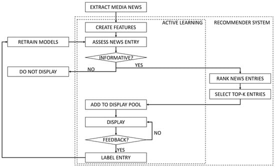 Fluxogram, showing how active learning and recommendations are implemented for media news event entries.