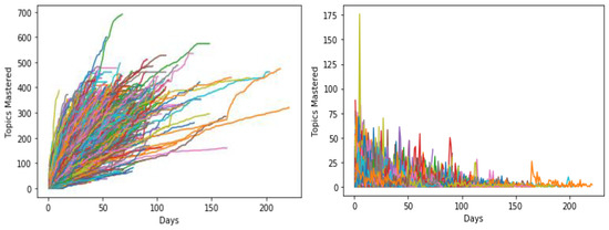 A student in ALEKS [63,64] goes through a knowledge check after every topic or every 120 min in the platform, based on whichever event happens first. If they clear the knowledge check, then they are recorded as mastering the topics assessed, and if they do not clear, then they are recorded as not mastering topics (even if they mastered them before). These topics mastered serve as the measure of progress to a student, and when they cover 90% of the topics in the course, they are considered to have completed the course. This research focuses on predicting the dropout occurrence, so we considered the topics mastered by these 2776 students. The data table holds a student and their entire learning information in one row. Here, we took the entire learning data and separate them by day. The progress (%) in assessment_report is the topics the student has mastered concerning the total 383 topics in this College Algebra and Problem-Solving course. The time_spent in timeandtopic_report is the time spent by the student on that day. We had to group the three datasets by Student ID and spread the information of each day out into multiple columns. This results in a sparse but fine-grained dataset. The complete dataset has 521 attribute columns, with each row holding the whole learning information of a student. The attribute that represents learning progression is the topics_mastered. In this complete dataset, we recorded the measurement of this attribute for each day. This attribute is a cumulative score, and Figure 2 (left). shows the rate of learning progression of each student. The changes in the learning progression of a student are the dataset from which we obtained multiple features to be used in the machine learning model. Figure 2 (right) visualizes the rate of changes in learning of each student.