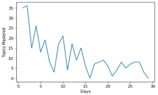 From the cleaned data, the topics mastered on each day that the student learns during a course is represented by the array of topics_mastered. The rate of student learning on a particular day is represented by a set of statistical features from the array. The most common statistical features employed are the average, standard deviation, variance, skewness, and kurtosis [66,67]. The graph of student learning expressed as topic mastered over time is shown in Figure 4. We can see that the curve is very rough, so average alone cannot aptly represent the rate of learning. Hence, the average calculated in windows through the time series was obtained. This list of averages along with the average can give an overview of the rate of learning and is called the moving average, and the normalized value of this list is used as a feature. Three moving averages with different window sizes, along with the average, were considered. This gives four features to represent the rate of changes in learning. Since the curve in Figure 4 is very rough, four features, namely skew, standard deviation, variance, and kurtosis, are used to represent this roughness. The other features used in the analysis are topics_mastered, overall trajectory, and final trajectory. The relationship between the first and the last day in distribution is calculated as overall trajectory The relationship between the last two days in distribution is calculated as the final trajectory.