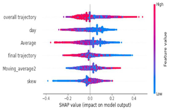 SHAP plots are visualizations used to identify the most important contributor to the model’s predictions. SHAP is a relatively new visualization technique used to evaluate the features used in the machine learning model for individual predictions. It plays an important role in visualizing the contribution of features towards the prediction by the model [76]. These plots show the feature as they contribute to either the positive or the negative class in the prediction and how the model is moved step by step by the features towards its predictions.