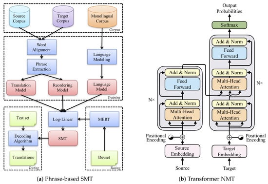 - Koehn, P.; Hoang, H.; Birch, A.; Callison-Burch, C.; Federico, M.; Bertoldi, N.; Cowan, B.; Shen, W.; Moran, C.; Zens, R.; et al. Moses: Open Source Toolkit for Statistical Machine Translation. In Proceedings of the 45th Annual Meeting of the Association for Computational Linguistics, Prague, Czech Republic, 23–30 June 2007; pp. 177–180. [Google Scholar]