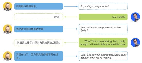 Dialogue is a written or spoken conversational exchange between two or more people, expressing human emotions, moods, attitudes, and personality []. Nowadays there is a huge demand for cross-language dialogue communication between people, and advances in machine translation (MT) for improving communication (or translation) have been seen in recent years. MT is a sequence-to-sequence prediction task, which aims to find for a source language sentence the most probable target language sentence that shares the most similar meaning. Dialogue machine translation comprises a number of significant application domains such as audiovisual subtitles, meeting transcripts, instant messaging, and speech-to-speech interpretation. Although neural machine translation (NMT) [,,] has achieved great progress in recent years, translating dialogues is still a challenging task due to its inherent characteristics such as data limitation, irregular expressions, discourse properties, and personality traits. To address corresponding problems, a number of works are exploited to improve the translation quality of dialogue translation systems.