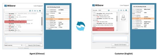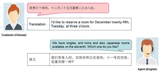 Dialogue translation can help real-life systems such as a hotel-booking conversation online system, which can efficiently and accurately assist customers and agents in different languages to reach an agreement in a dialogue for the hotel booking. Ref. [] showcases a semantics-enhanced task-oriented dialogue translation system with novel features: (1) task-oriented named entity (NE) definition and a hybrid strategy for NE recognition and translation; and (2) a novel grounded semantic method for dialogue understanding and task-order management.