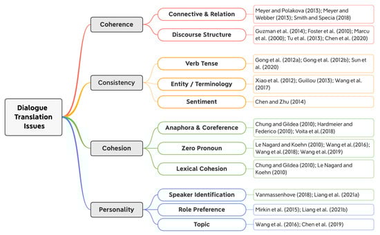 As discussed in Section 3.1, there are different strands of research in the literature. One attempts to exploit the macroscopic structure of the input texts to infer better translations in terms of discourse properties, including cohesion, coherence, and consistency. Other work deals with specific linguistic phenomena that are governed by discourse-level processes, such as the generation of anaphoric pronouns and translation of discourse connectives. These strands are not isolated, but closely related to each other. For instance, document-level information can not only improve the overall performance of MT but also alleviate inconsistency problems at the same time. Furthermore, some researchers investigated effects of characteristics of dialogue on MT [,,]. Instead of reviewing all existing approaches, we mainly introduce three representative ones: document-level architecture, discourse phenomena for dialogue MT, and translation with speaker information.